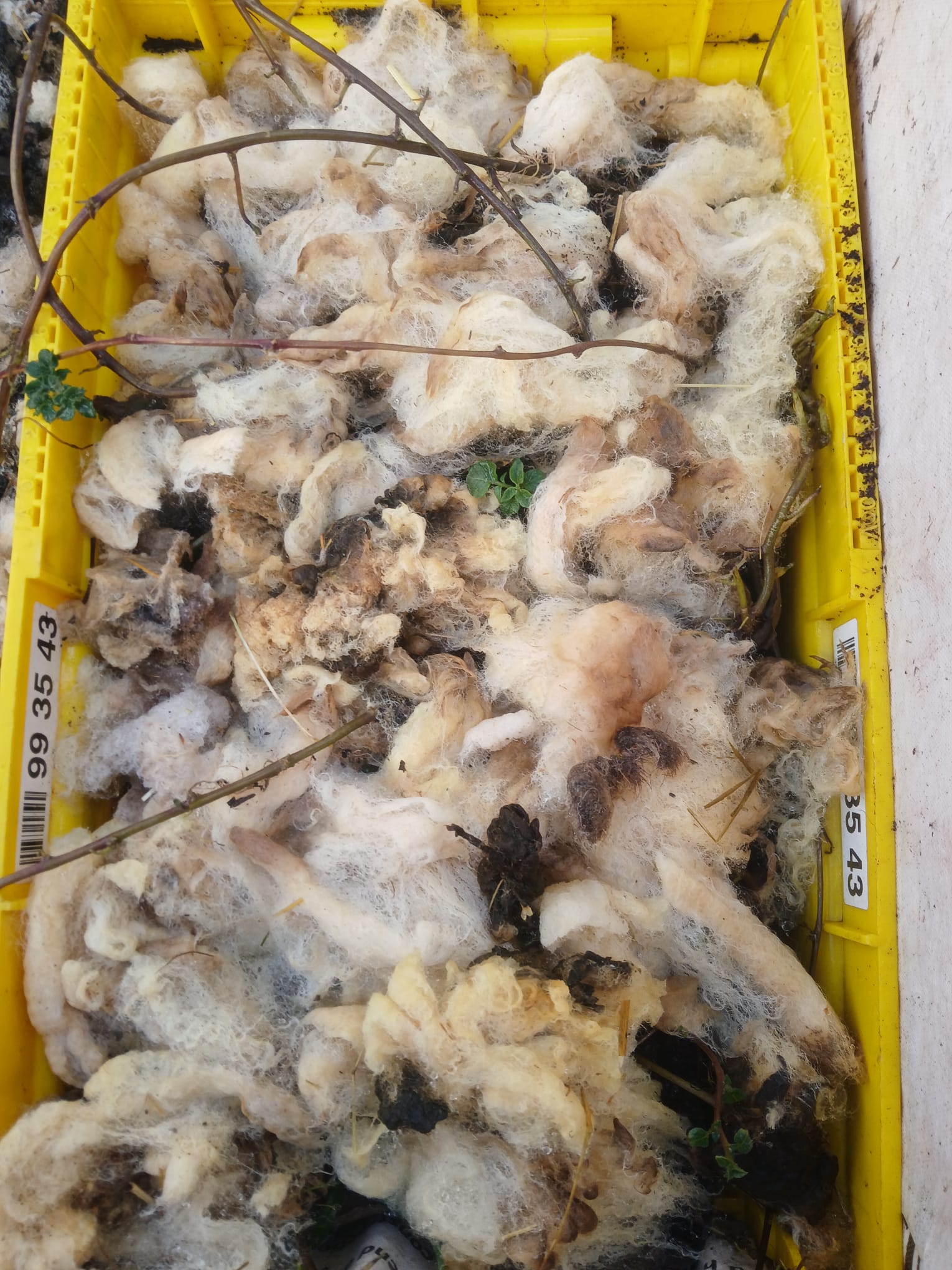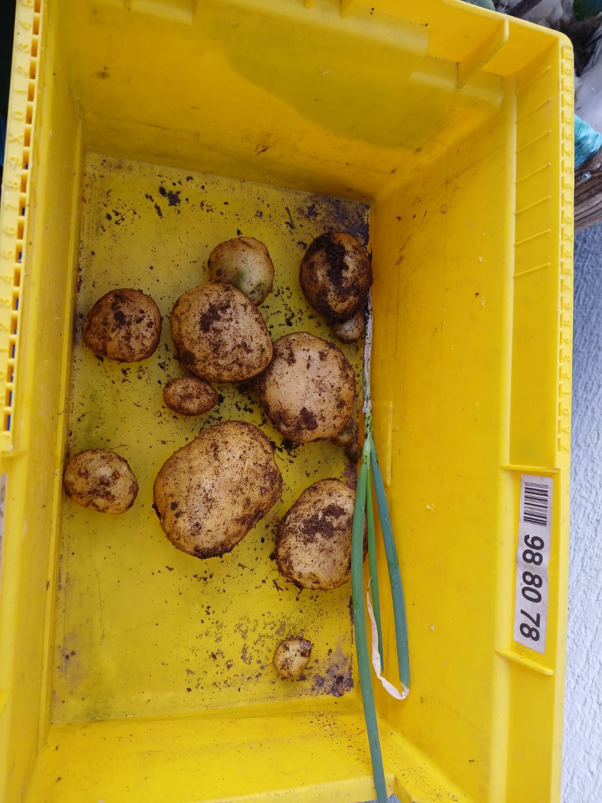 Ein Foto vom Anbau (vom letzten Jahr) selbst gibt es leider nicht – wohl aber von der Ernte. Dieses Jahr haben wir ein Foto in einer weiteren Anbauvariante mit keimenden Kartoffeln, die nicht mehr zum Verzehr geeignet waren.